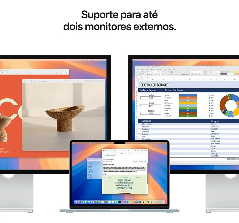 Tela de 13,6 polegadas na diagonal retroiluminada por LED, com tecnologia IPS2; resolução nativa de 2560 x 1664 com 224 pixels por polegada