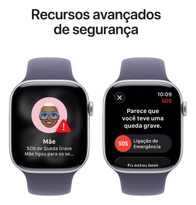 • RECURSOS DE SEGURANÇA — O Series 11 é capaz de identificar uma queda ou acidente grave de carro, ligar automaticamente para os serviços de resgate e alertar seus contatos de emergência¹¹. E o recurso Chegou Bem envia uma notificação automática avisando pessoas próximas ou da família da sua chegada ao destino.