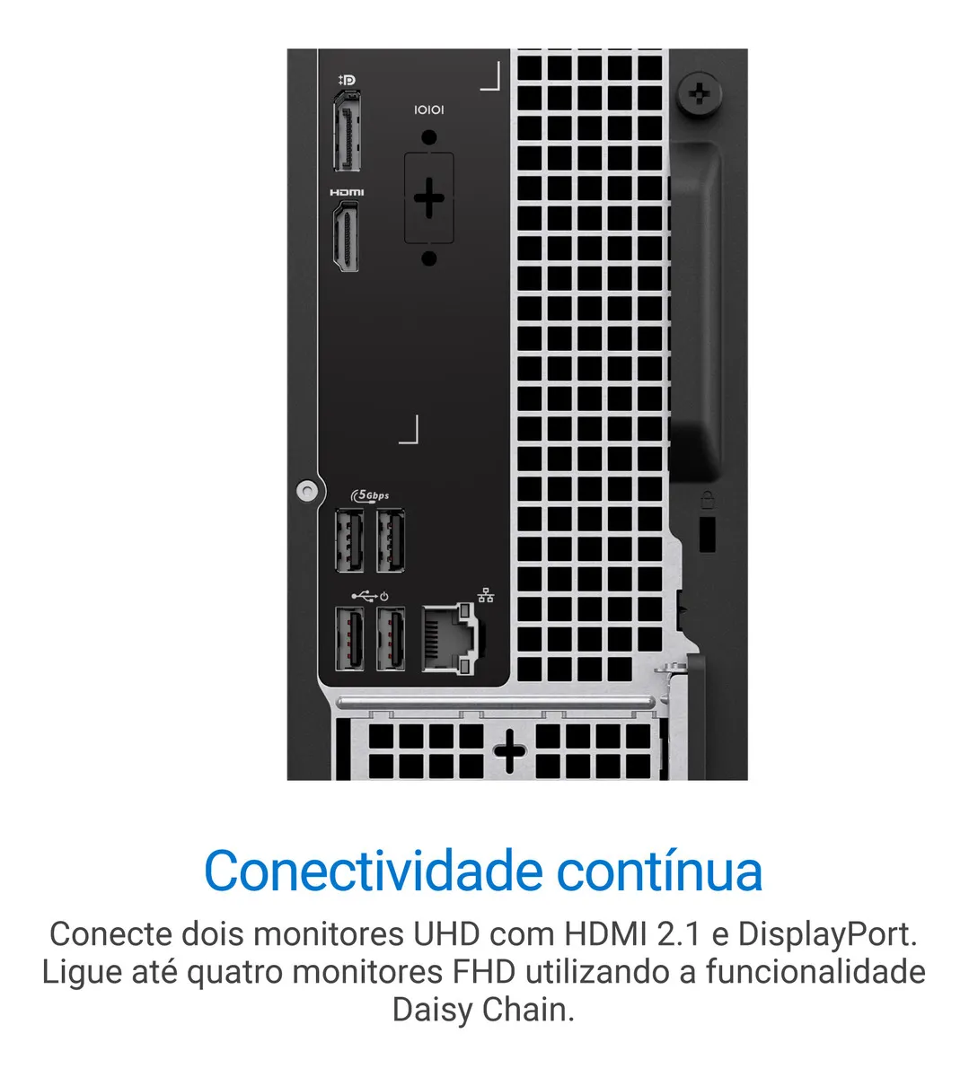 Portas: Frente: 1 Porta USB 3.2 Gen 1 Type-A, 1 Porta USB 3.2 Gen 1 Type-C, 2 Portas USB 2.0, Combo Jack (conector para fone de ouvido e microfone combinados) | Portas traseiras: 2 Portas USB 3.2 Gen 1 Type-A, 2 Portas USB 2.0, 1 Entrada RJ-45, 1 Saída HDMI, 1 Porta de vídeo DisplayPort 1.4