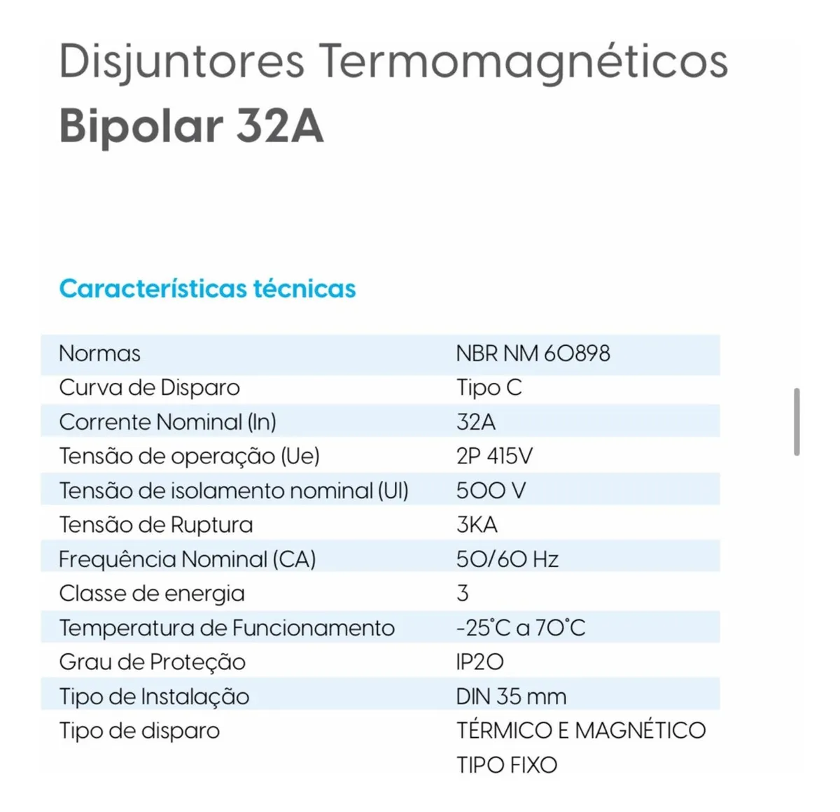 Disjuntor Duplo Bipolar Elgin 10a 16a 20a 25a 32a 40a 50a 63 32a
