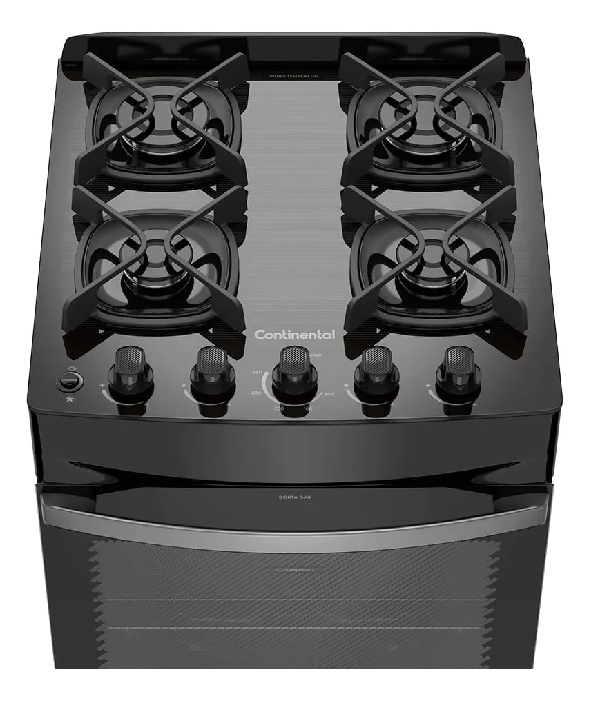 O Fogão 4 Bocas Continental Preto econômico com Mesa de Vidro e Grades de Ferro Fundido FC4GB é eficiente e proporciona mais economia para o seu dia a dia, além de garantir mais facilidade de limpeza.