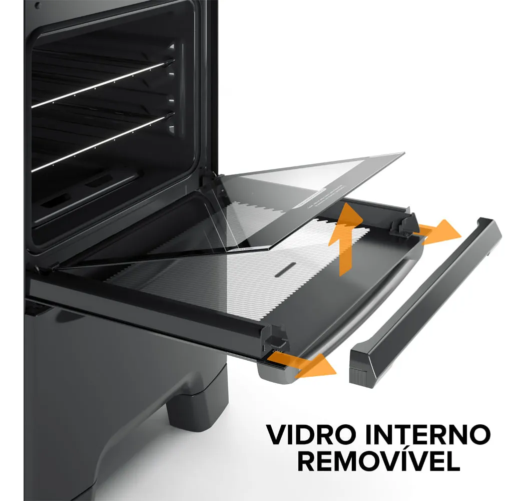 O fogão conta com o Vidro Interno Removível para garantir uma limpeza mais profunda e completa do seu forno.