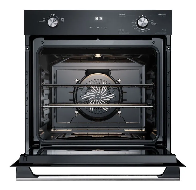 Já a Convecção, assa tudo por igual através de um ventilador interno que circula o ar quente de forma uniforme e garante uma temperatura homogênea em todos os cantos e alturas do forno.