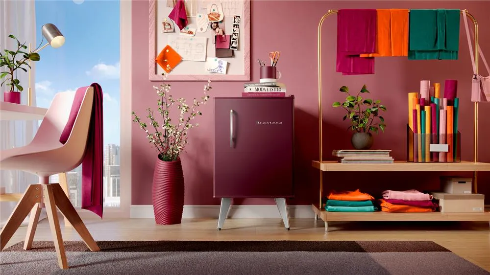 As cores do Frigobar Brastemp Retrô são autênticas e refletem o espírito retrô, com detalhes metálicos e texturizados inspirados nas tendências atuais do design.
