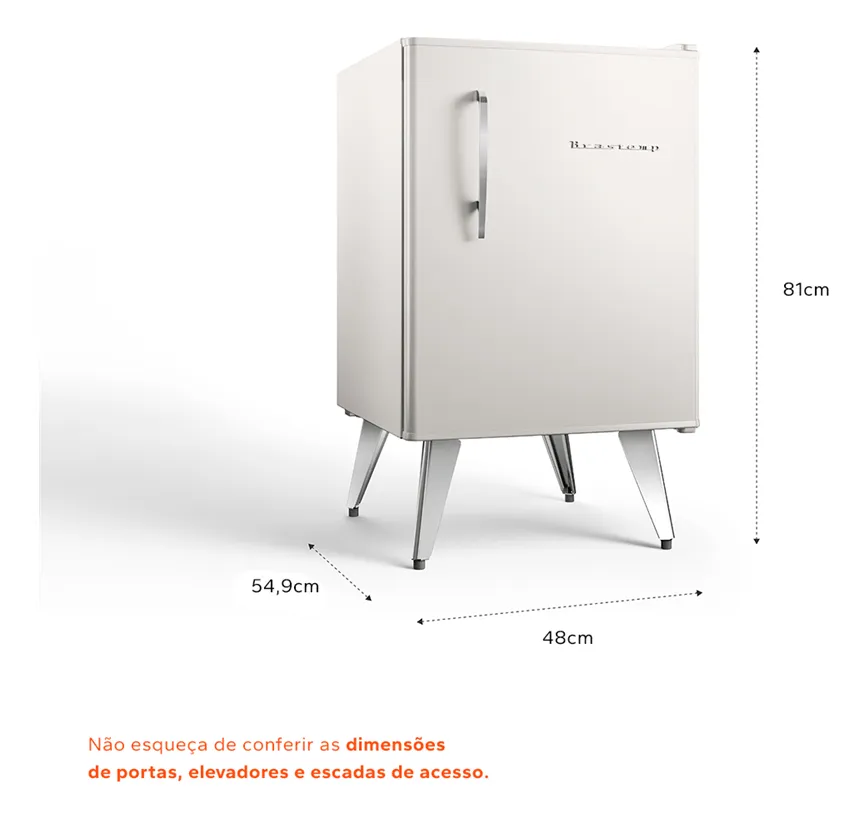Com 76 litros de capacidade, o Frigobar Brastemp Retrô une charme e desempenho para conservar bebidas e alimentos com elegância. O modelo conta com controle de temperatura, porta-latas, separador de garrafas e três prateleiras internas para melhor organização. Sua estética retrô na cor Classic White é perfeita para compor ambientes com personalidade.