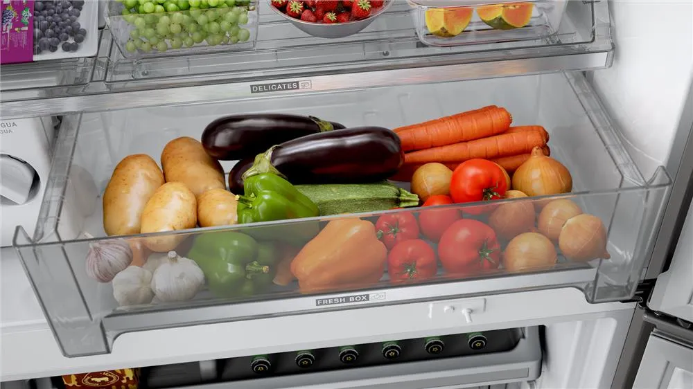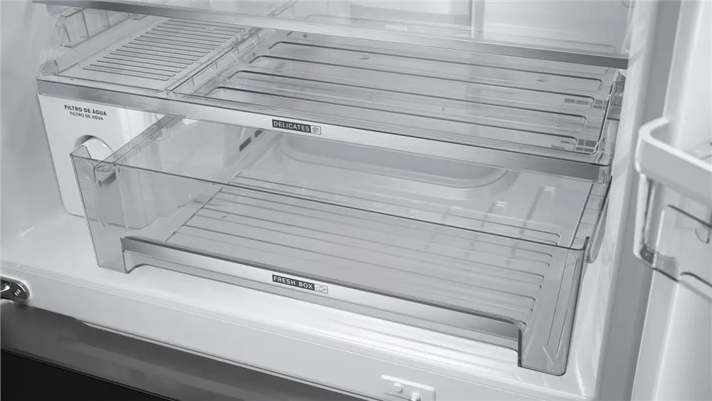 As prateleiras de vidro temperado e borda infinita combinadas à iluminação em LED oferecem uma visão panorâmica e clara no interior da geladeira. Design feito para você ter tudo ao alcance dos seus olhos.