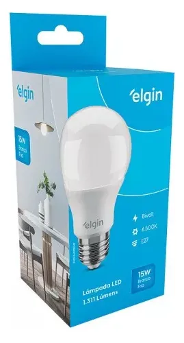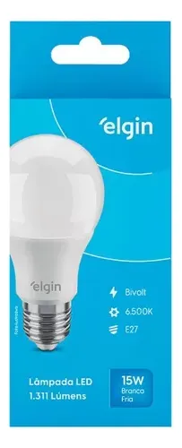 Características Técnicas: LAMPADA LED, TIPO A60, EMBALAGEM TIPO CAIXA, COM DISPOSITIVO DE CONTROLE INCORPORADO A BASE, MATERIAL EMPREGADO PLASTICO TIPO PC, DISSIPADOR DE ALUMINIO, LED E COMPONENTES ELETRÔNICOS, POTENCIA DE 15 WATTS, TENSAO DE 100-240 VOLTS, FLUXO LUMINOSO DE 1350 LUMENS, EFICIENCIA DE 90 LM/W, TEMPERATURA DE COR DE 6500 KELVIN, BASE E27, MARCA ELGIN, REF. 48BLED2F15YU, REGISTRO INMETRO 000743/2020 E COD. DE BARRAS 7897013586279