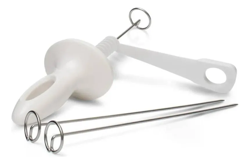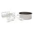 Conjunto de acessórios altamente funcionais composto por uma forma para assar, uma grelha, três espetos e um fatiador de vegetais em espiral.