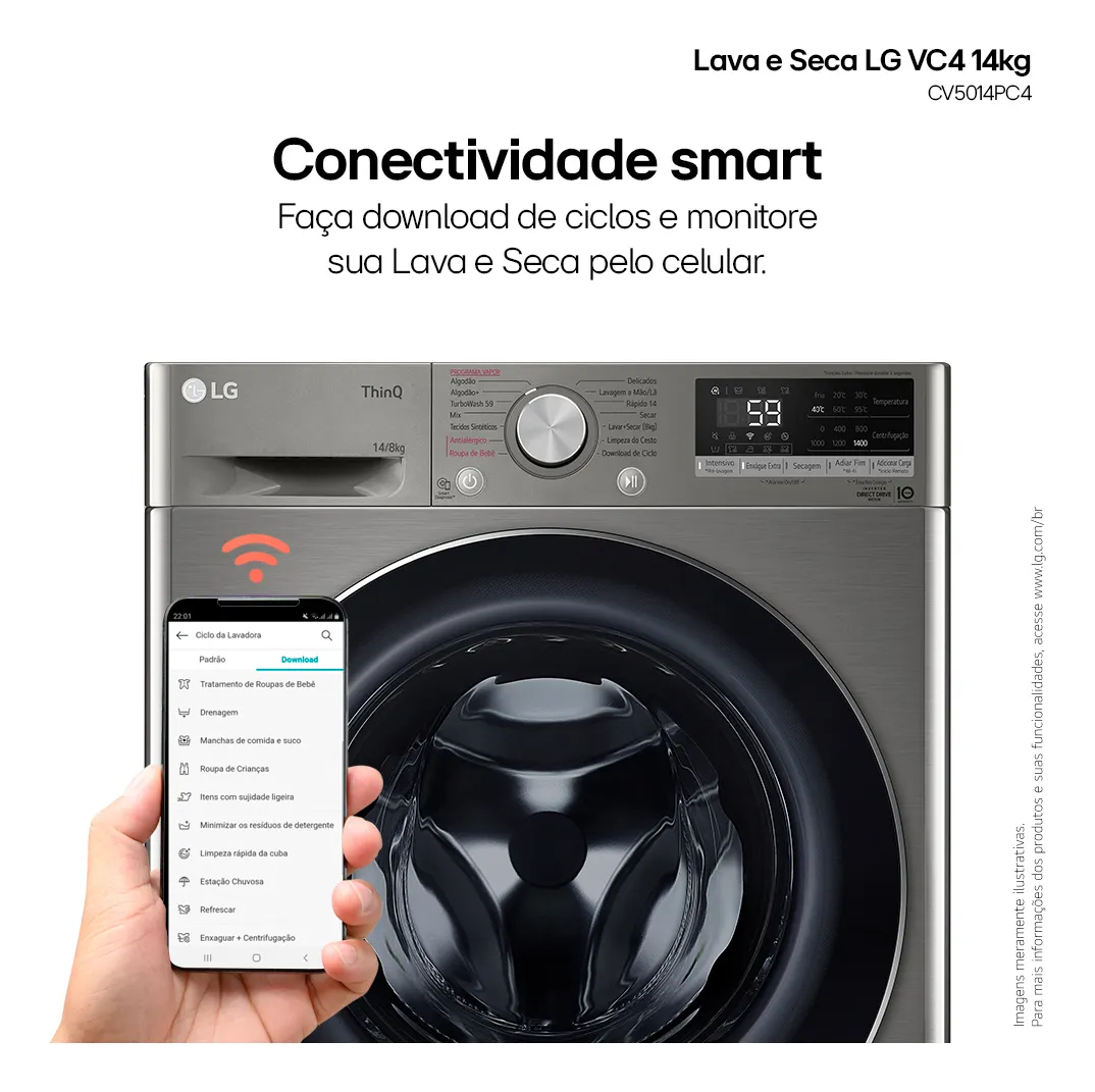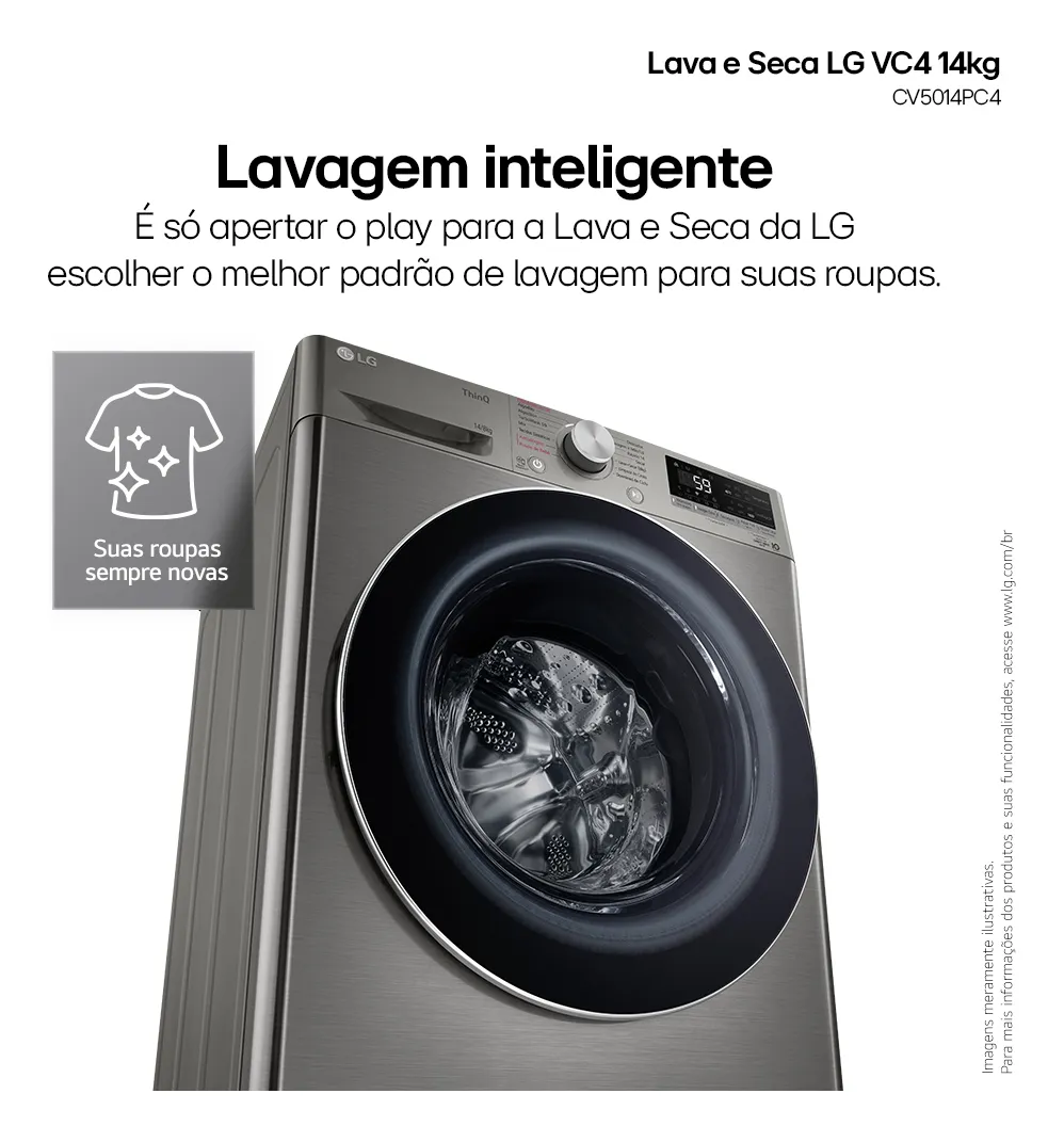 Conteúdo da embalagem: 1 Lava e Seca LG Smart VC4 com Inteligência Artificial AI DD CV5014PC4 14Kg e 8Kg