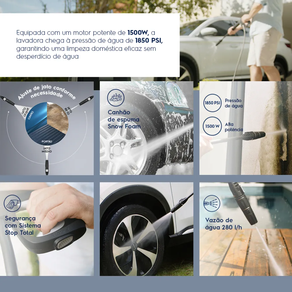 O porta acessórios com suporte para cabo elétrico e mangueira promove mais segurança e organização. Equipada com um motor potente de 1500 W, a lavadora chega à pressão de água de 1850 PSI e garante uma limpeza profunda em qualquer situação.