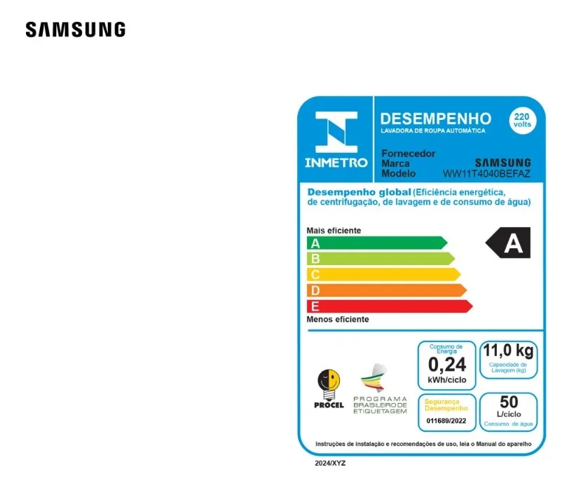 A lavadora Samsung WW11T consome menos água por ciclo quando comparadas com outros modelos de mesma capacidade disponíveis no mercado, segundo testes do Inmetro. Economia para você e menos impacto no planeta.