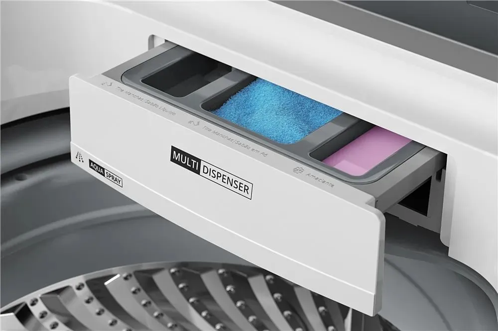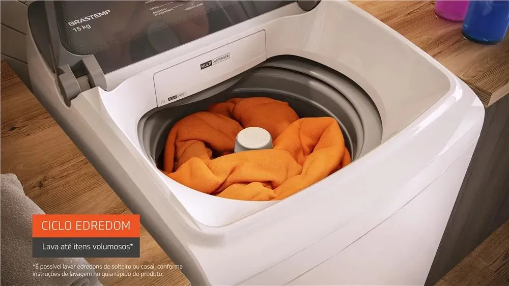 *Teste realizado com edredom dupla face casal 200 fios, tecidos 100% algodão, enchimento 100% poliéster e dimensões 2,2 m x 2,4 m nas configurações padrão do ciclo, utilizando as quantidades de detergente em pó/líquido e amaciante recomendados.