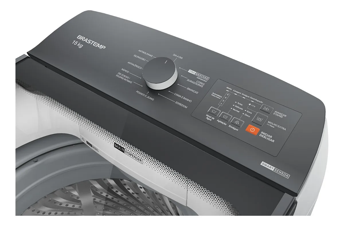 Além disso, conta com potência de 580W, 15 kg de capacidade, design moderno e resistente à água, cesto em inox, painel digital, eficiência energética A e ainda possui as funções nível de sujeira e turbo lavagem. Perfeita demais!