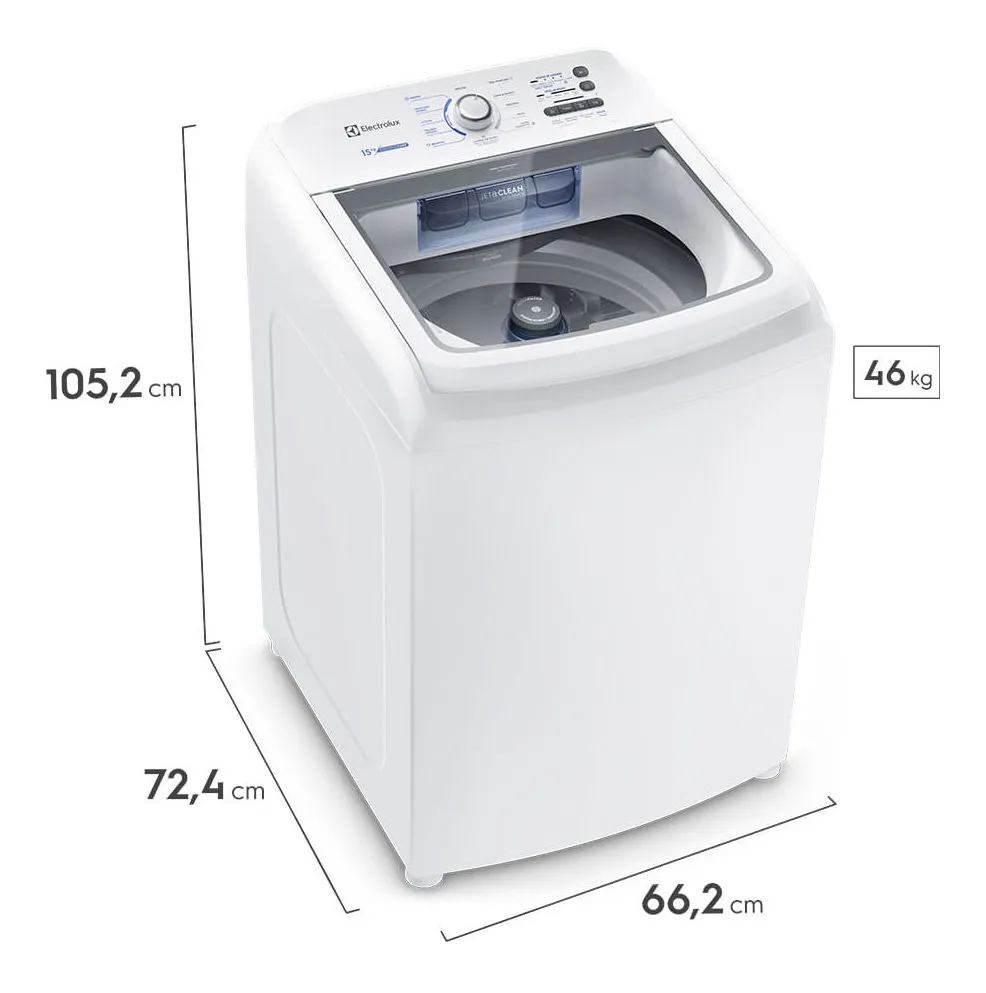 O tamanho das lavadoras pode variar entre os modelos. A máquina de lavar Electrolux 15 kg, por exemplo, apresenta 105,2 cm de altura, 66,2 cm de largura e 72,4 cm de profundidade.