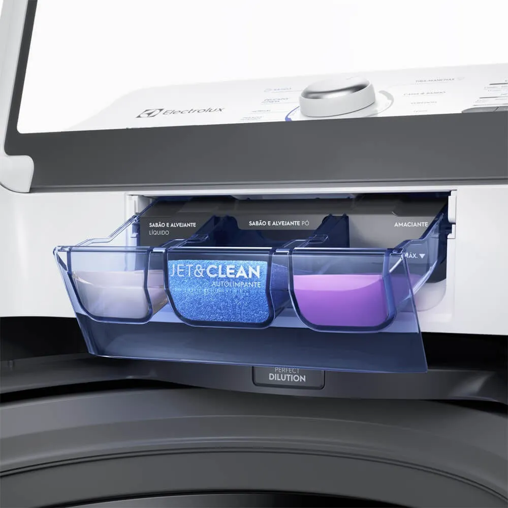 Dispenser autolimpante com tecnologia Jet&Clean, que através de fortes jatos de água otimiza o uso do sabão e do amaciante, além de diluí-los em até 100%¹ antes de entrarem em contato com as roupas, evitando manchas e relavagem. ¹Teste comparativo interno realizado com a LT10B (sem Jet&Clean), verificando a distribuição dos insumos líquidos na carga de roupa mais próxima ao fundo do cesto, segundo testes internos da Electrolux. Área atingida pelo amaciante de 99,99% e desvio padrão 0,01.. ³Jet&Clean é a tecnologia exclusiva da Electrolux, que proporciona diluição de 100% do sabão e amaciante através de jatos horizontais diretos na gaveta.