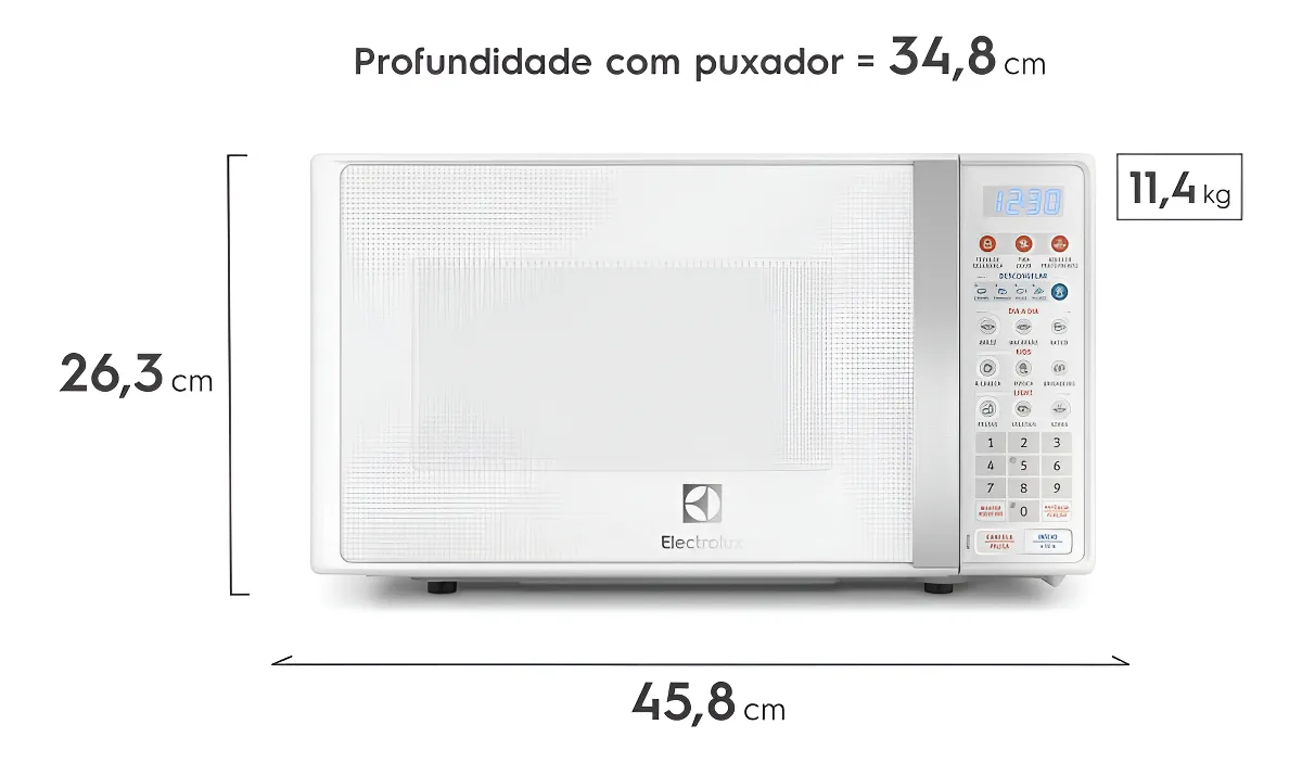 Com um dia a dia corrido, manter uma alimentação saudável não é nada fácil. Mas o micro-ondas Electrolux MTO30 é seu aliado nessa tarefa. Com um Menu Light, ele te ajuda a não sair da dieta com muito mais praticidade. E na hora que der vontade de doce, uma banana quentinha com um pouquinho de canela vai superbem. O melhor é que você não precisa se preocupar com o cheiro forte da fruta no micro-ondas. A Função Tira Odor minimiza os odores do interior do aparelho. Tira odor Com a função tira odor, seu micro-ondas minimiza os odores internos deixados por alimentos. Esqueça caderninhos de receita Possui um QR Code exclusivo que ensina o passo a passo da receita. Faça a leitura do QRCODE por um aplicativo de leitor de QR CODE no seu celular ou tablet e você será automaticamente direcionado para um link exclusivo contendo os vídeos com modo de preparo das receitas do menu. Mantém aquecido Com a função Manter Aquecido, suas receitas estarão sempre na temperatura certa até a hora de servir. Porta Espelhada Porta espelhada que traz mais modernidade e sofisticação para a sua cozinha. Menus e funções adicionais Possui o menu com a função descongelar podendo ser utilizada as opções carne, frango, peixe e feijão. Com o menu light, você pode prepara receitas mais saudáveis como frutas, vegetais e sopas. O menu kids, serve para preparar as receitas favoritas das crianças como bolo de caneca, pipoca e brigadeiro. E o menu dia-a-dia que separa as receitas mais usadas como o arroz, macarrão e batata. Segurança e comodidade Exclusiva tecla que permite travar o uso do aparelho quando você quiser. Evitando que crianças ou pessoas não autorizadas a usar o produto possam acioná-lo. Reaqueça suas refeições Com essa exclusiva opção, você reaquece seus pratos prontos. Os alimentos vão ficar frescos, como se tivessem sido feitos na hora. Escolha a potência Você pode escolher a potência que prefere para esquentar seus alimentos, assim eles vão ficar na temperatura ideal ao seu paladar.