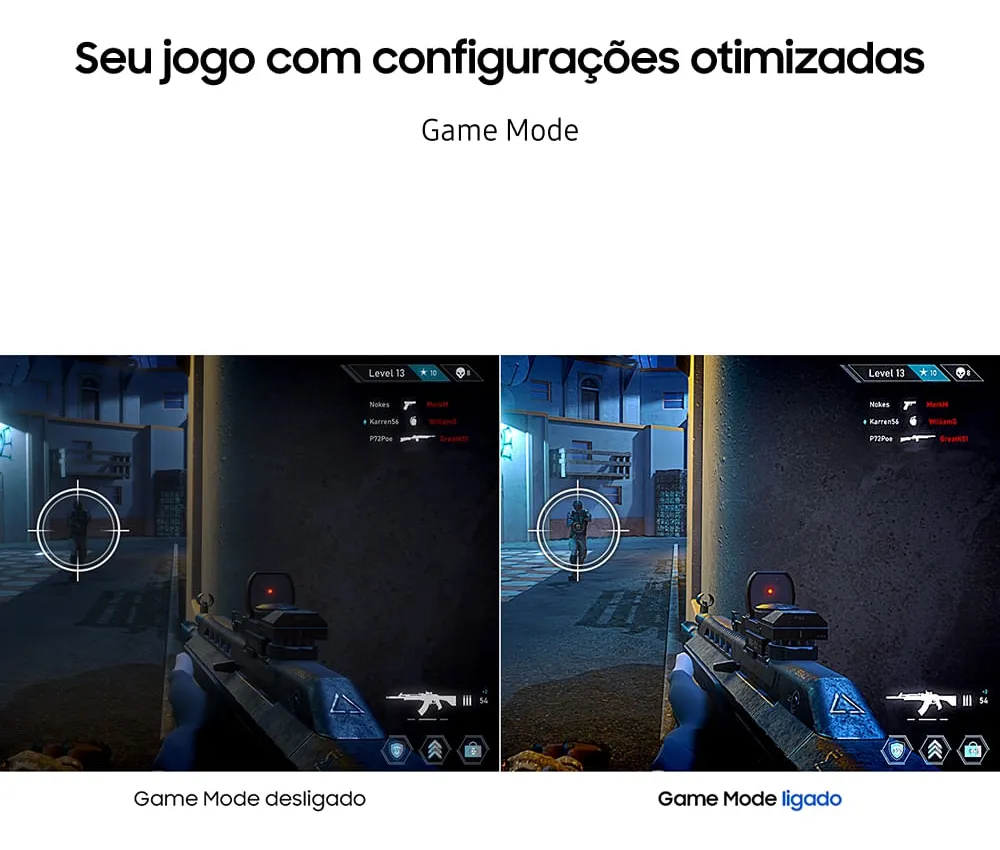Configurações de jogo otimizadas, vantagem instantânea. O Game Mode ajusta qualquer jogo para preencher sua tela com todos os detalhes à vista. Seus jogos com cores vivas e maior contraste de imagem para detectar inimigos escondidos no escuro.
