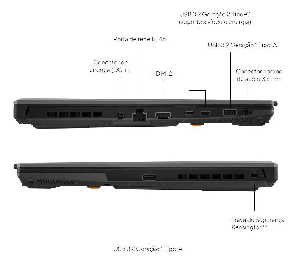 Para manter você sempre conectado, o notebook gamer ainda oferece vasta gama de portas para dispositivos, incluindo USB Tipo-A e Tipo-C, HDMI 2.1, porta de rede RJ-45, conector combo de áudio de 3,5 mm e entrada de energia dedicada (DC-in).