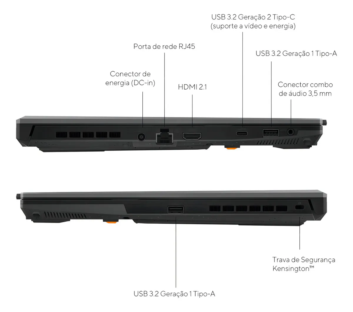 Para manter você sempre conectado, o notebook gamer ainda oferece vasta gama de portas para dispositivos, incluindo USB Tipo-A e Tipo-C, HDMI 2.1, porta de rede RJ-45, conector combo de áudio de 3,5 mm e entrada de energia dedicada (DC-in).