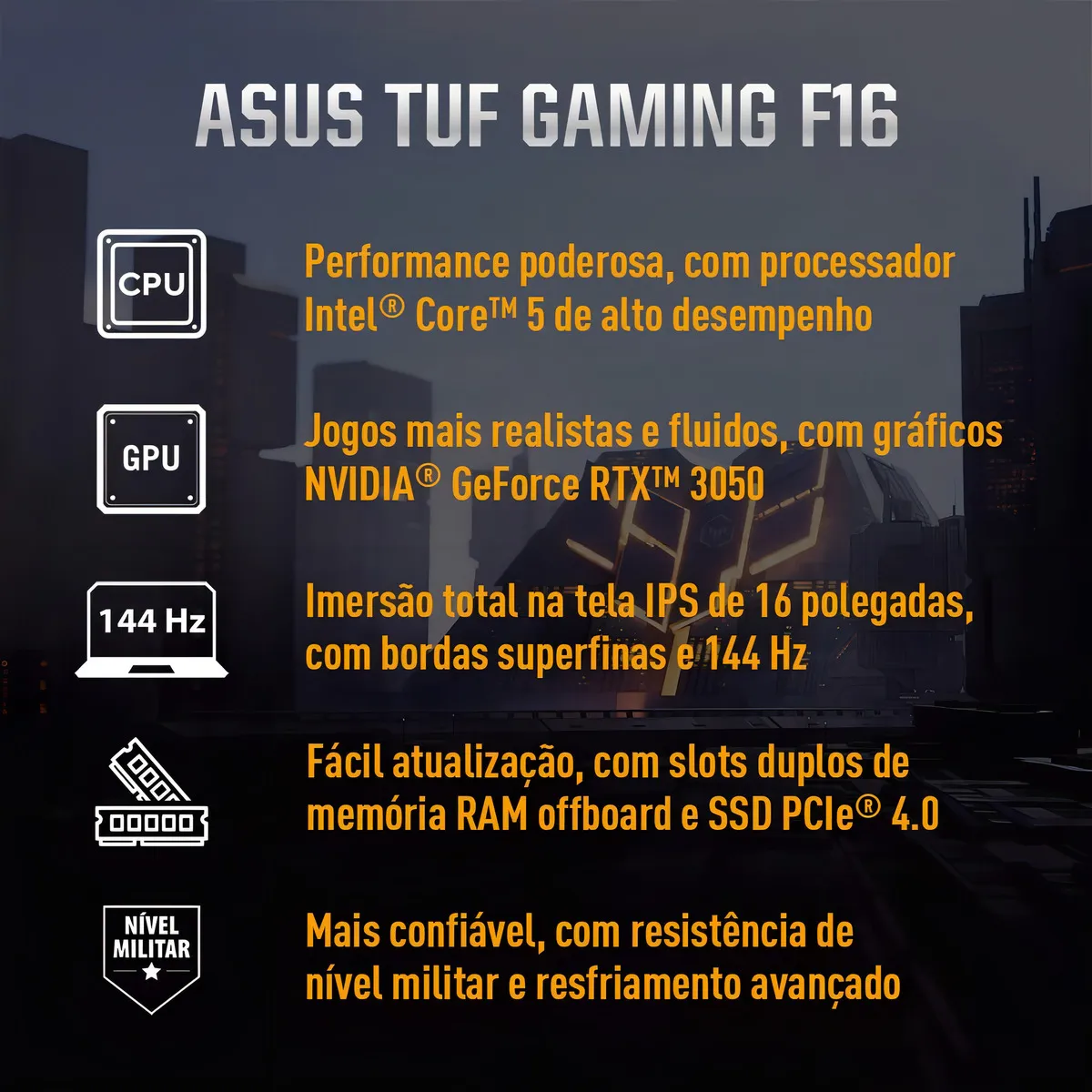 O poderoso notebook gamer ASUS TUF Gaming F16 une performance de alto nível com design robusto e estiloso. Feito para gamers exigentes e profissionais que buscam tecnologia de ponta, este computador transforma a experiência de jogo e trabalho, com processador Intel Core 5 210H de alto desempenho e gráficos dedicados NVIDIA® GeForce RTX 3050. Há ainda tela imersiva com bordas finas, fácil atualização de memória RAM e SSD, e resistência de nível militar para aguentar qualquer tranco.