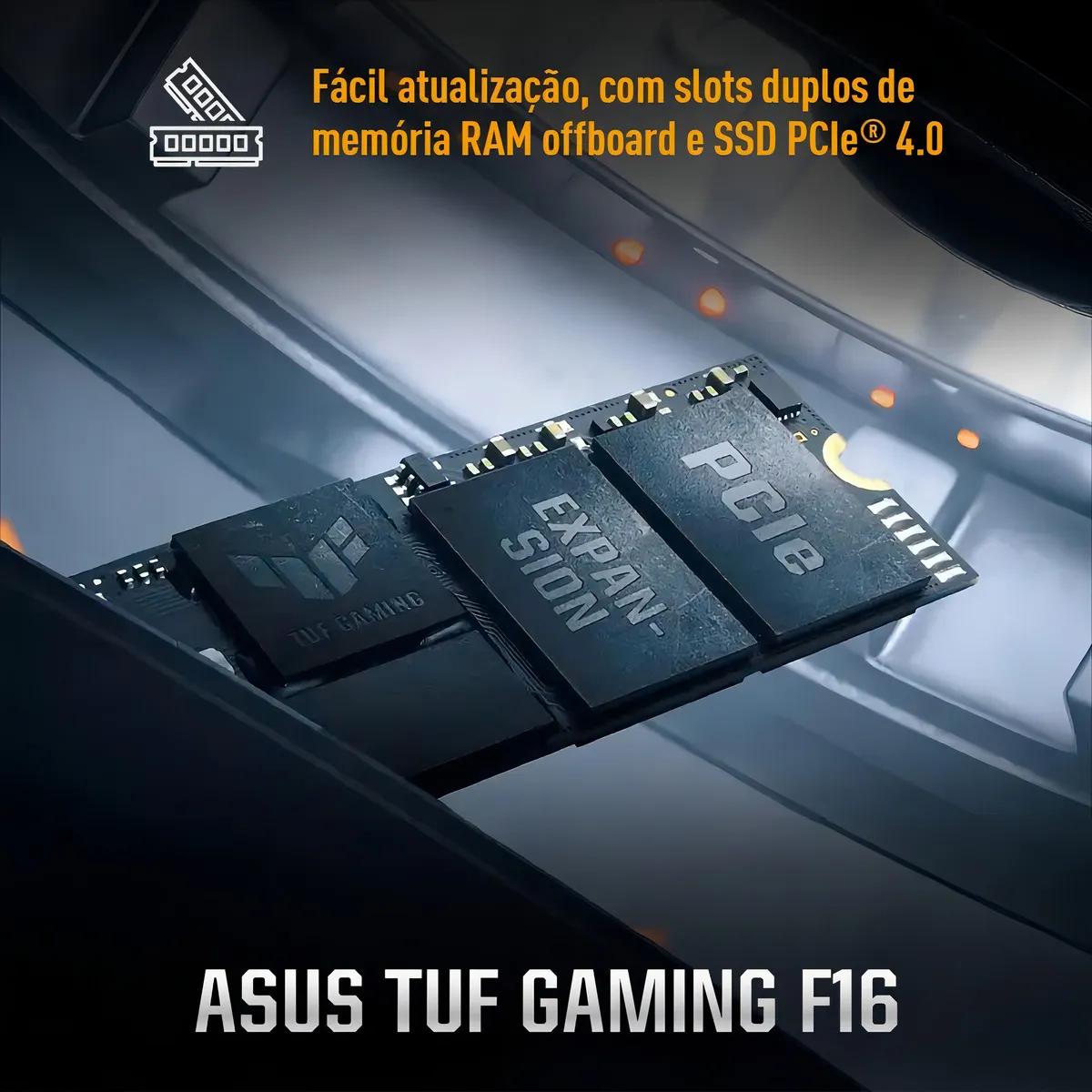 Pensando na personalização e no futuro, o ASUS TUF Gaming F16 foi desenvolvido para facilitar upgrades. Com slots duplos de memória RAM offboard e dois espaços para SSD PCIe® 4.0 disponíveis, você tem total flexibilidade para expandir as configurações conforme suas necessidades.