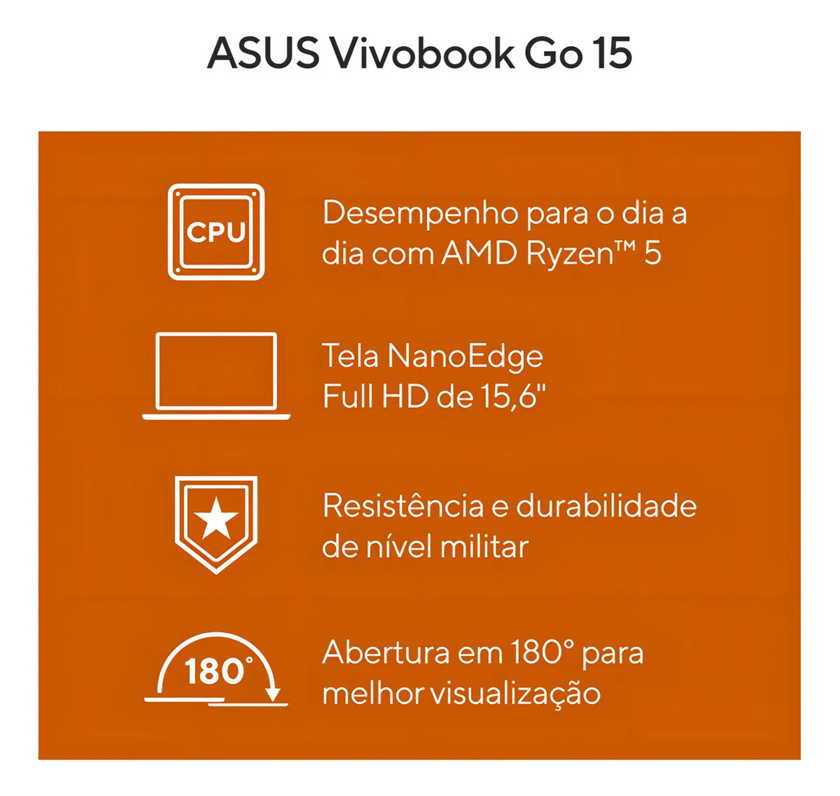 Notebook ASUS Vivobook Go E1504FA AMD Ryzen 5 7520U 8GB Ram 256GB SSD Tela 15,6″ FHD Black – NJ825W. É leve e compacto, projetado para torná-lo produtivo e mantê-lo entretido onde quer que você vá! Com processador AMD Ryzen 5 7520U de excelente desempenho, 8GB de memória RAM LPDDR51 e 256 GB de SSD2, é perfeito para seu dia a dia. Ainda conta com uma dobradiça plana de 180°, tampa física protetora na webcam e muitos recursos de design bem pensados — incluindo uma tela de 15 polegadas antirreflexo Full HD.