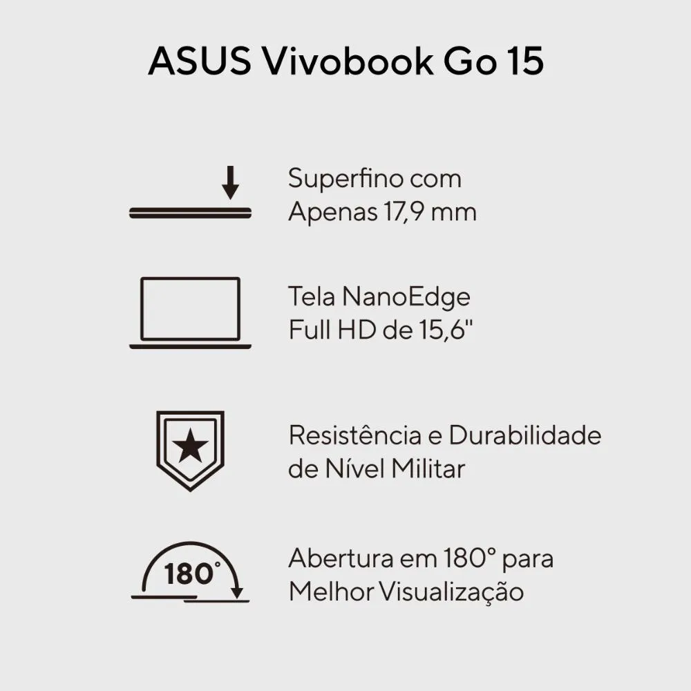 É leve. É compacto. É o ASUS Vivobook Go 15. Projetado para torná-lo produtivo e mantê-lo entretido onde quer que você vá! Com processador Intel Core i3-N305 de excelente desempenho, perfeito para seu dia a dia. Ainda conta com uma dobradiça plana de 180°, tampa física protetora na webcam e muitos recursos de design bem pensados — incluindo uma tela de 15 polegadas antirreflexo Full HD — tudo para que você vá além!