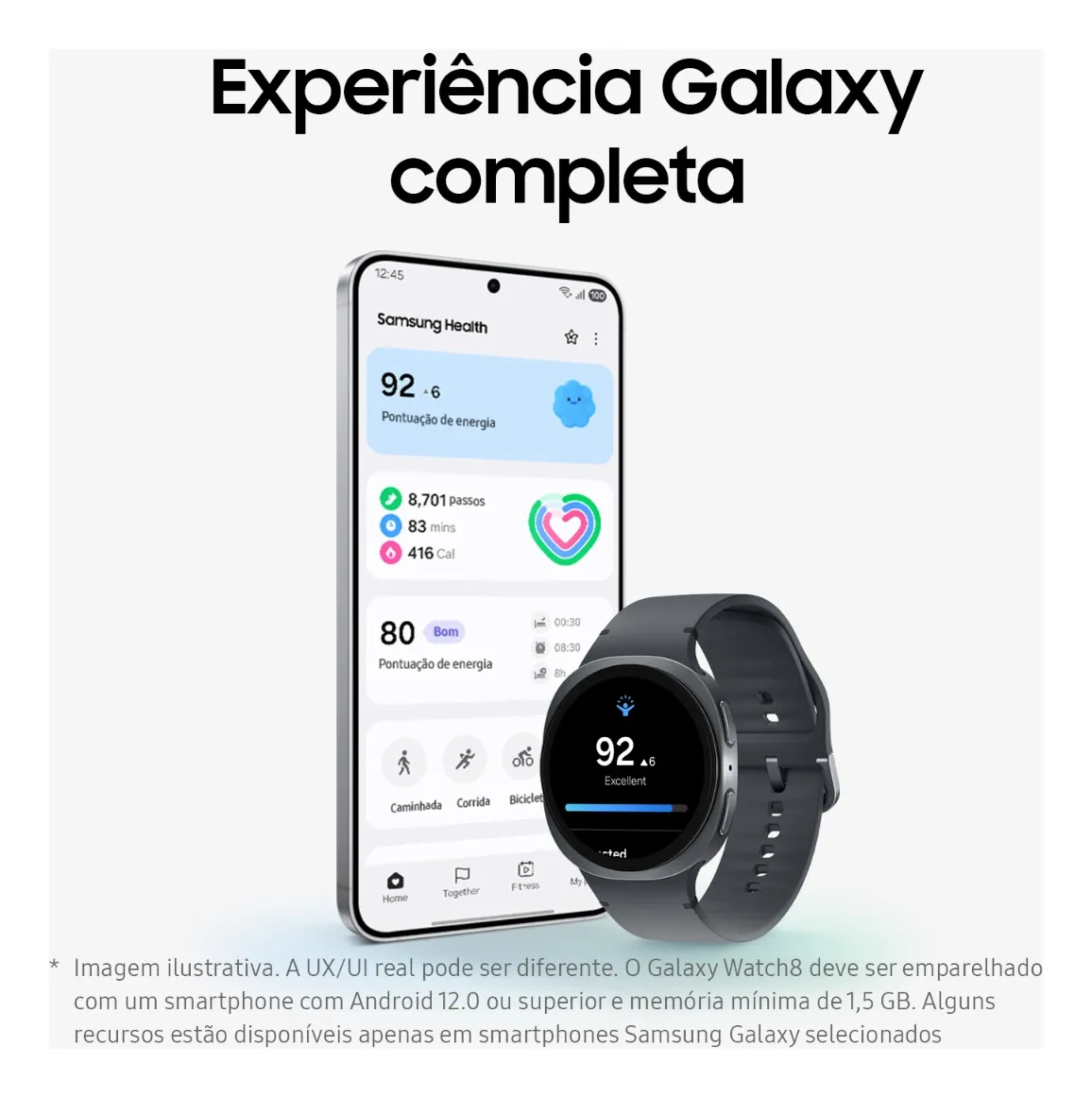 O Watch8 é mais do que um simples acessório, é uma expressão de modernidade e minimalismo. Seu design acolchoado se adapta perfeitamente a diferentes estilos de vida. Equipado com um processador mais rápido e uma bateria de longa duração, o Watch8 supera os desafios do dia, oferecendo desempenho fluido e uso prolongado. A tela 50% mais luminosa mantém a nitidez e o brilho, mesmo sob luz solar intensa. Com o Watch One UI 8, o design inovador proporciona uma visão mais rica e expansiva, facilitando a visualização de notificações de relance em uma única tela. O Watch8 é um verdadeiro guardião do bem-estar, oferecendo cuidados personalizados com o sono, treinador de corrida, gestão da saúde vascular e mais. Ele analisa a temperatura e a umidade do ambiente para garantir condições ideais de descanso, detecta apneia do sono e reflete esses indicadores na sua Pontuação de Sono atualizada, ajudando você a verificar o quão preparado está para o dia. O treinador de corrida personalizado oferece uma análise do nível de corrida, fornecendo feedback e ajudando a alcançar sua primeira maratona. Acesse até 160 planos de treinamento personalizados e adaptados ao seu nível. Use seu relógio para dormir e acorde com insights sobre a saúde do coração. A Carga Vascular monitora hábitos diários que afetam sua saúde vascular, incluindo sono, dieta, atividade e estresse. Além disso, o Watch8 oferece gestão de antioxidantes, acompanhando seus níveis para uma melhor saúde e retardando o envelhecimento. Acompanhe sua dieta e obtenha seu índice de AGEs durante a noite. O Samsung Health monitora sua ingestão de alimentos e gera seu índice de AGEs enquanto você dorme. Receba alertas para níveis elevados de estresse e dicas de atenção plena para ajudar a prevenir o estresse crônico. Acesse rapidamente o Gemini no seu Galaxy Watch com apenas um toque ou gesto, mesmo sem o seu telefone. Levante seu pulso para falar e iniciar o Gemini para o que você precisar. Envie mensagens instantaneamente com a sua voz, sem necessidade de digitar, e aproveite as respostas sugeridas pela AI. Desfrute de uma conectividade contínua e poderosa entre seus dispositivos Galaxy. Controle o seu Watch com simples gestos de pinça dupla, ao agitar ou fazer o movimento de “Toc Toc” para tirar fotos, controlar suas mídias, desligar alarme e muito mais. Encontre seu dispositivo perdido com precisão usando o Samsung Find, disponível offline. Receba uma notificação imediatamente se você deixar seu Watch para trás. A UX redesenhada proporciona uma experiência otimizada por IA com uma estética refinada, oferecendo recomendações para aplicativos usados com frequência. Respostas instantâneas e intuitivas antecipam a intenção do usuário com movimentos fluidos, e o Watch8 oferece suporte a mais aplicativos, sendo o primeiro Smartwatch a rodar o Wear OS 6.