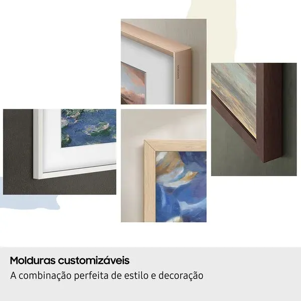Adapte a The Frame ao seu ambiente com molduras magnéticas de diferentes cores e estilos. A instalação é simples e rápida, permitindo que a TV se integre perfeitamente à decoração do seu espaço.