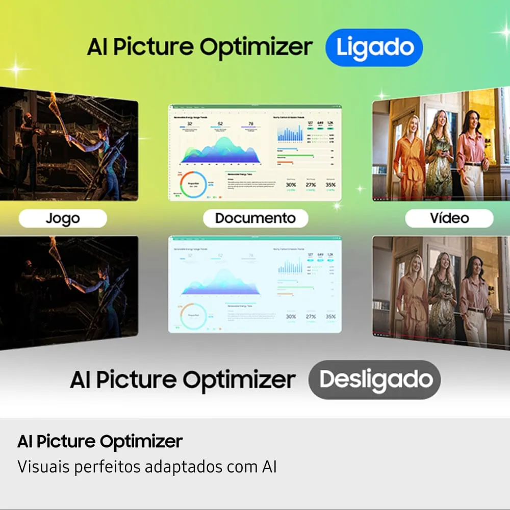 O recurso AI Picture Otimizer adapta os visuais para ajudar você a trabalhar em documentos com conforto nos olhos, mergulhar totalmente em jogos com pretos profundos e assistir a videos com cores vibrantes